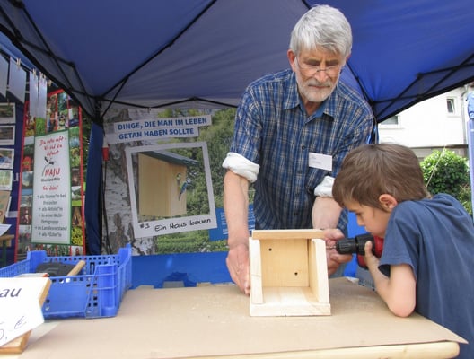Im großen Ausstellungszelt des Projekts Lebensader Oberrhein konnten die Kinder kreative Blumenkarten basteln und an unterschiedlichen Stationen viel über das nasse Element lernen. Kinder bauten mit Eltern die angebotenen Nistkästen zusammen oder bastelten kleine Insektenhotels. Auch am Stand der NAJU wurde eifrig an Seedballs gewerkelt. Ein besonderer Magnet war sicherlich die durch Aktive der Ortsgruppe Alzey angebotene Möglichkeit, kleine Fossilien aus dem Stein zu klopfen und mitzunehmen – es blieben keine Steine übrig.